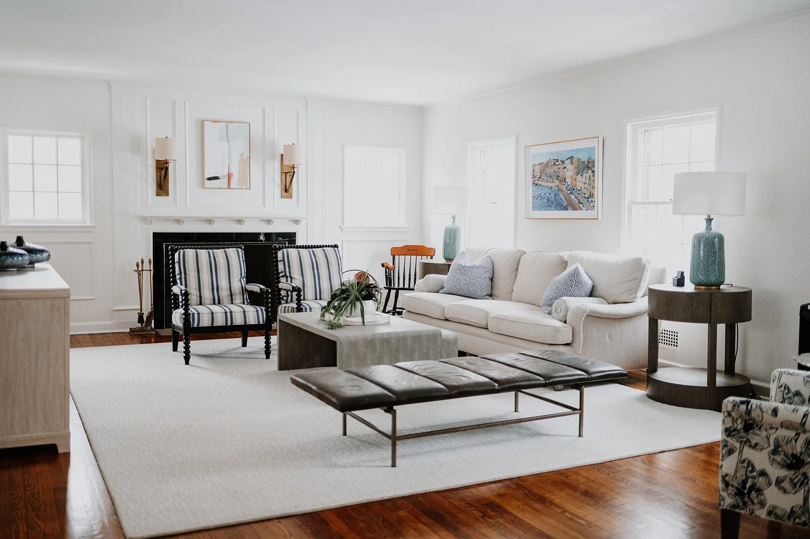 The first goal was to make the living room family-friendly yet elevated. Nothing was to be too precious—the space was meant to be lived-in, appropriate for all ages. Fabrics and finishes were important; everything needed to be easily cleaned.