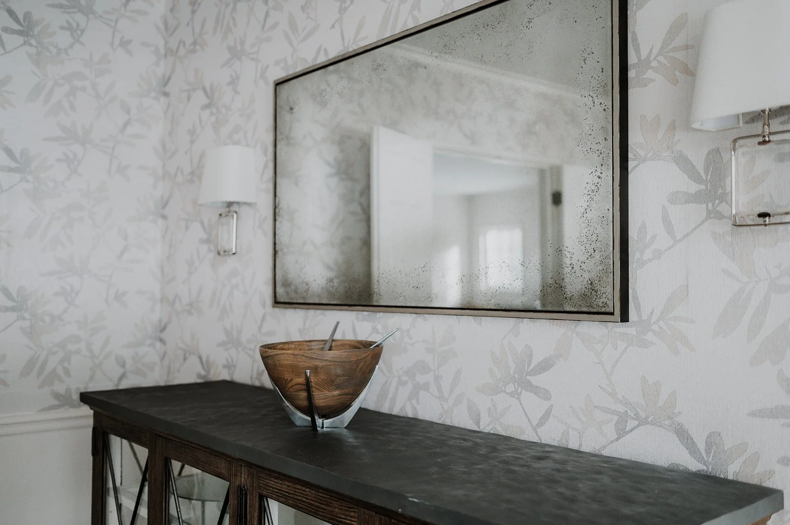 The whole home palette began in this space with the idea for daylight to be plentiful. Blues, caramels and creams reflect the light rather than absorb it. Window treatments were kept minimal for the same reason. A built-in wall unit, original to the home, was disassembled and overhauled; wallpaper backing, updated hardware and curated styling make it the new star of the room. In the adjacent dining space—where the family eats dinner together nightly—the color palette continues and is greeted by elegant wallpaper and a modern chandelier.