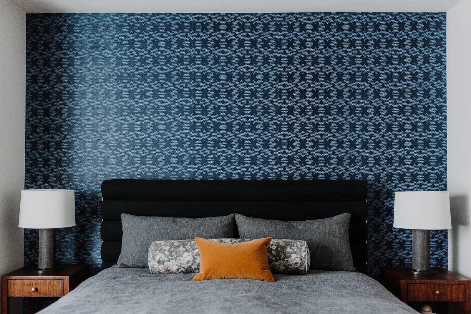 In the third-floor primary bedroom, a locally-made custom bed offers classic luxury and hidden drawer storage underneath. Geometric, saturated wallpaper behind the headboard accents the space, and custom bed pillows call back to the color palette of the living room painting. The primary bath received a facelift, with updating plumbing and hardware, repainted vanity and custom mirror.