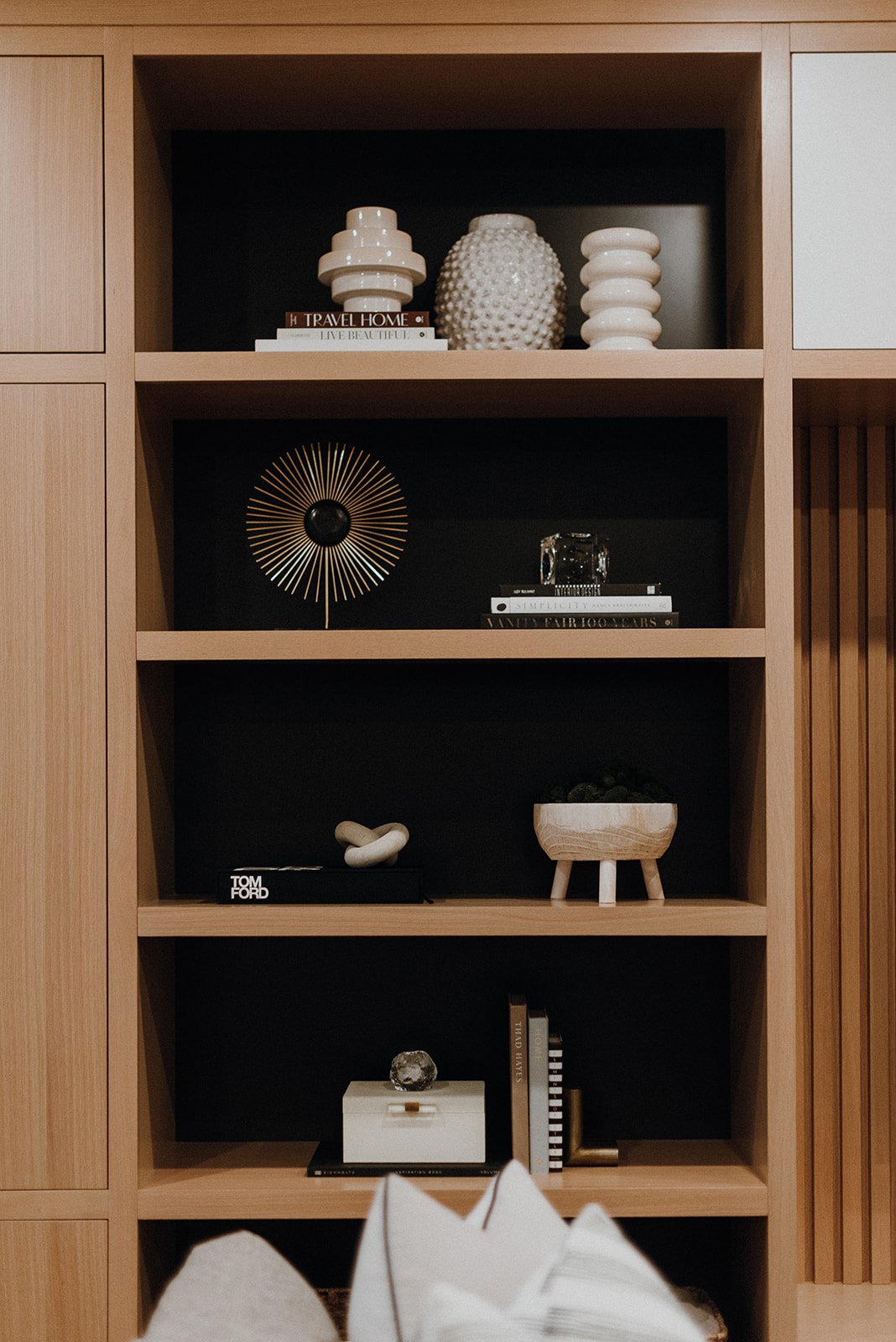 Allowing the fresh space to guide the design, an already-existing alcove was the perfect place for a much-desired custom rock wall. Keeping the mix of black, white and oak wood tone throughout the space, Sadie focused on building out the custom rock wall to the homeowner’s specifications. Custom oak slat on the surrounding walls brings an extra level of visual interest, and extends into lower bench seating to create cohesion.