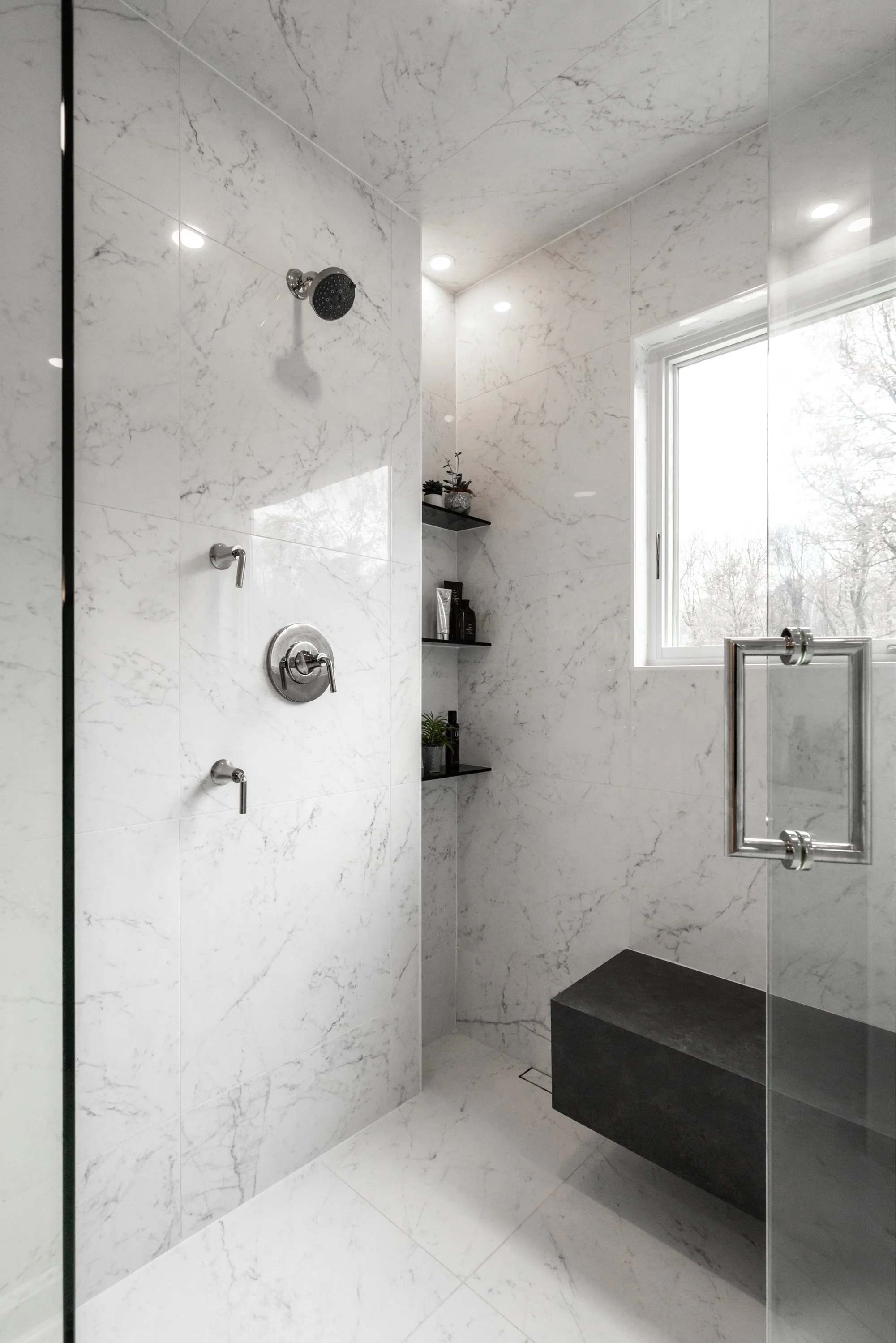 The primary bathroom was an oversized space that craved definition and brightness. Dawn and her team started by designing a luxe showering experience. A new window brings views of nature, and large-format Italian porcelain tiles line the floors and walls. A shower niche with black glass shelving pairs with a black floating bench. Showerheads are placed on the walls and ceiling.