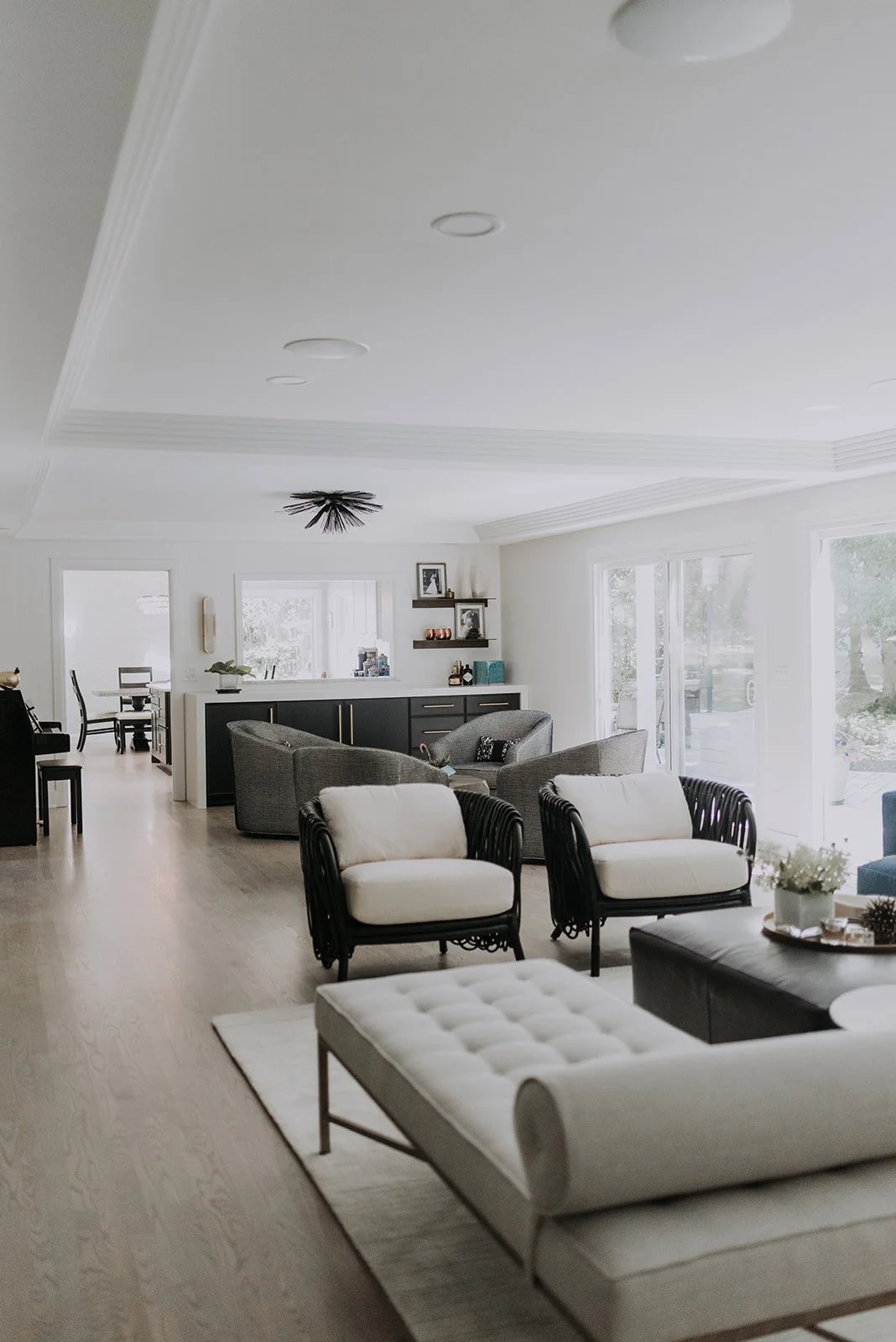 Using a stepped moulding technique on the ceiling, Dawn defined the space into two areas: one for gathering, and one for conversation. The floor plan was opened up to establish a family-friendly environment. Bold, feminine qualities were worked tastefully into the modernized space. Custom built-ins are surrounded by floral wallpaper and art deco-inspired hardware.