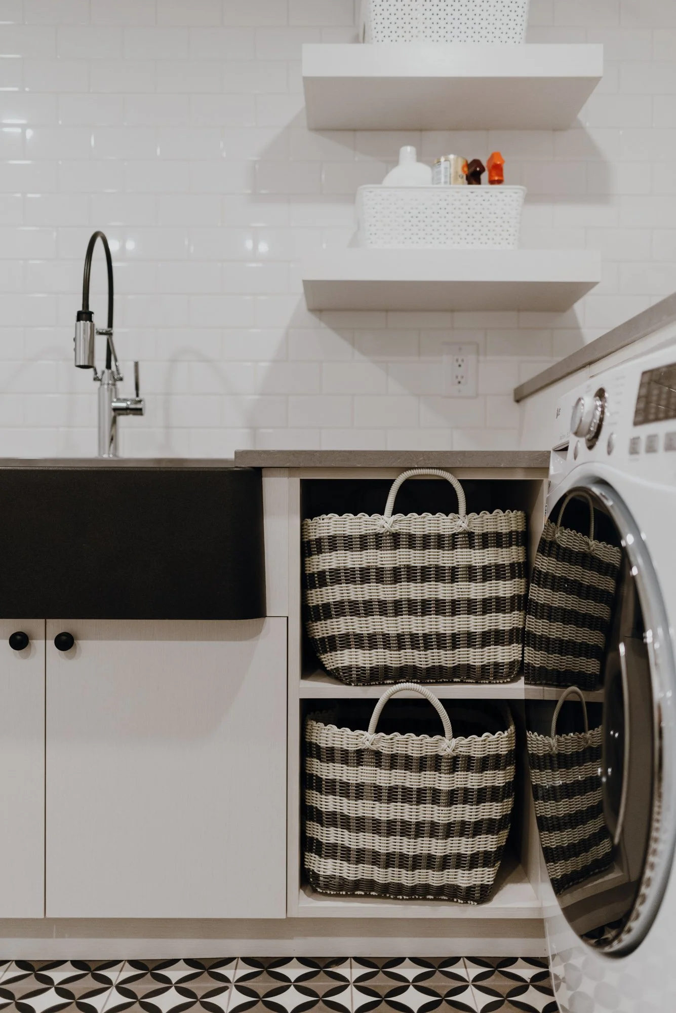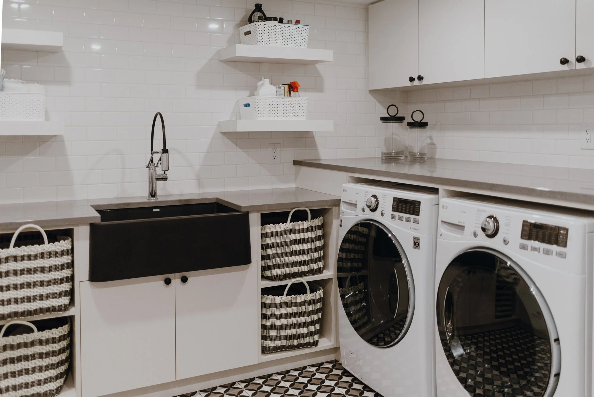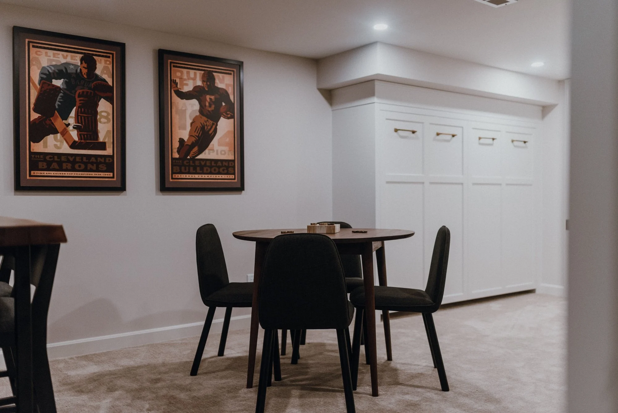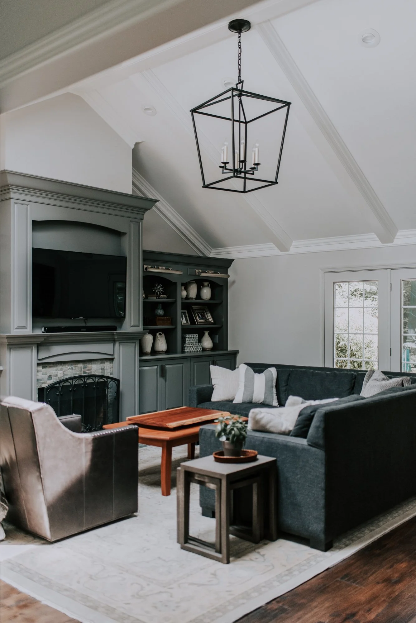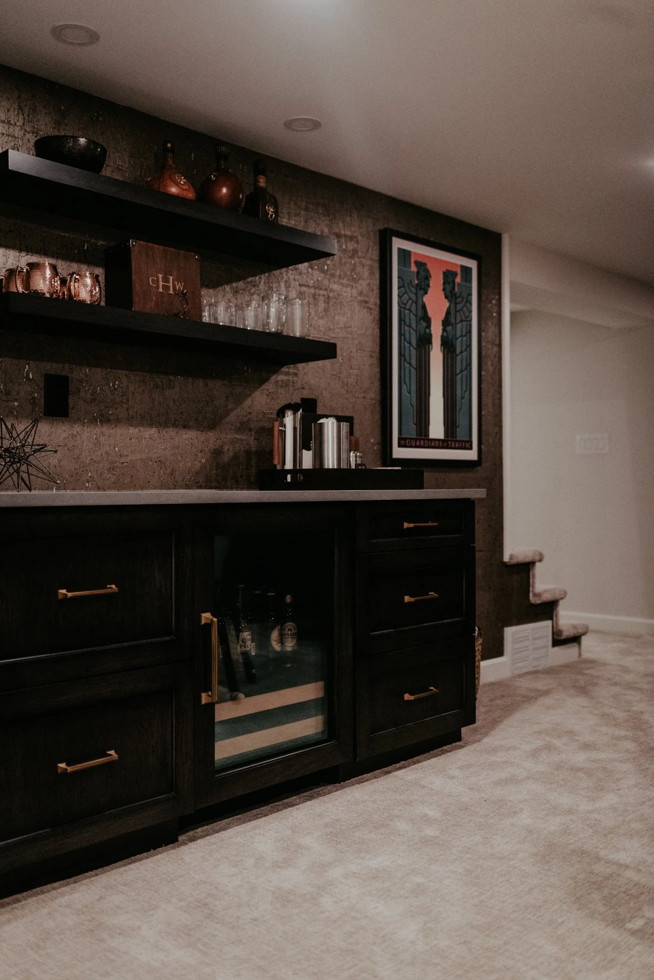 Recently, the couple completed their many-year renovation with their basement. The ceiling height was elevated for openness. A new bath and Murphy bed set in place for guests. Above the fireplace, custom built-ins, covered windows and an installed bar are fit for gathering.