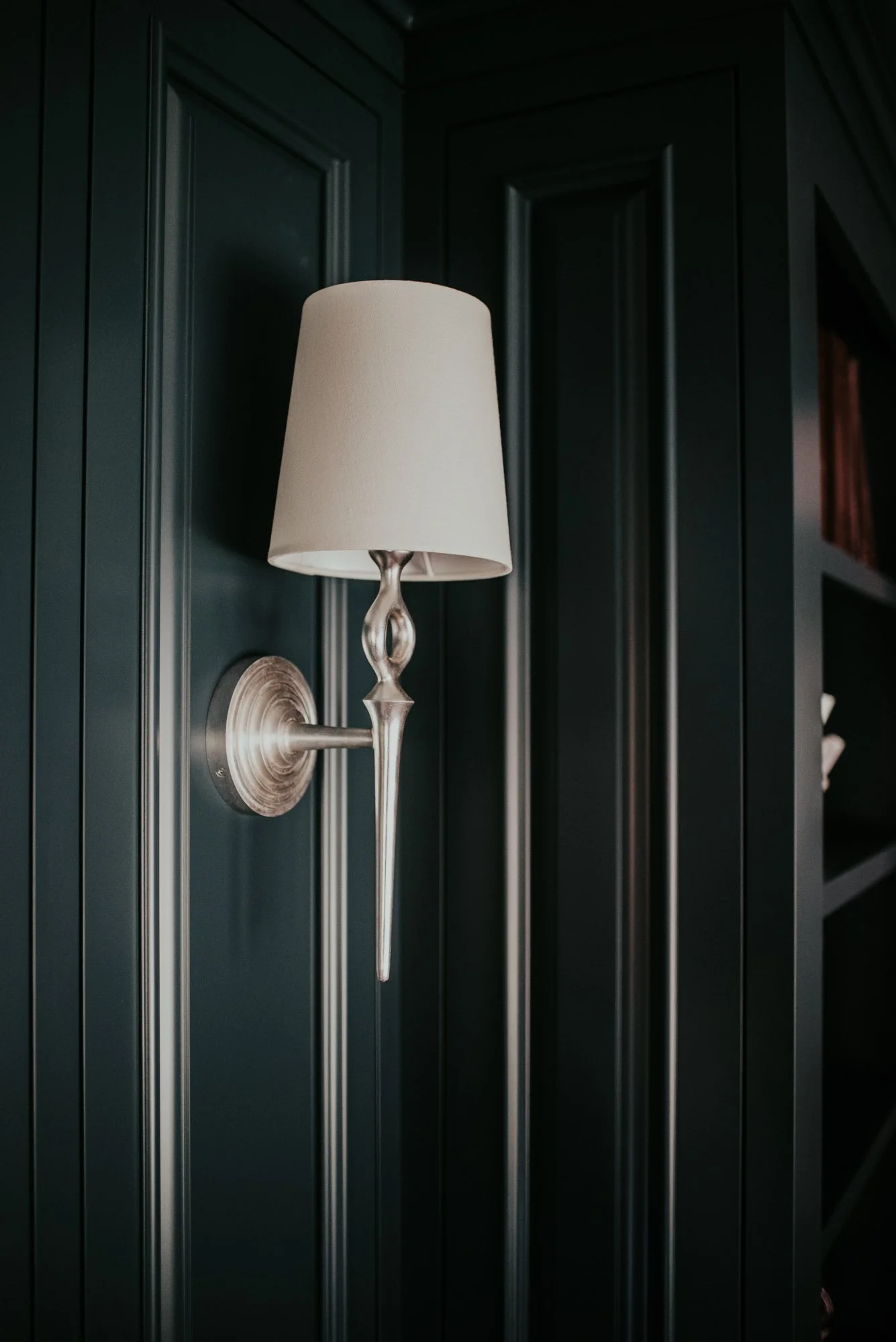 The couple renovated their home library into a pleasant haven. Taking inspiration from other areas of the home, Dawn continued the palette of blue but opted for a more saturated hue. Old paneling was removed and the ceiling covered with a metallic paint. The orientation of the room was updated to make way for custom peacock blue built-ins and updated lighting. Shelves were filled with familiar relics sparking memories and contemplation.