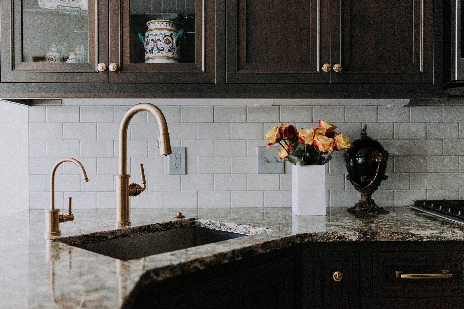 In the kitchen, warm walnut cabinetry was custom-designed to establish a cohesive, functional flow and properly display the homeowner’s beloved Italian pottery. The Romanesque space is enhanced through Italian valance embellishments, ceramic decor, patterned rug and bronze detailing. The reformatted layout incorporates a custom banquette suited for formal dining.