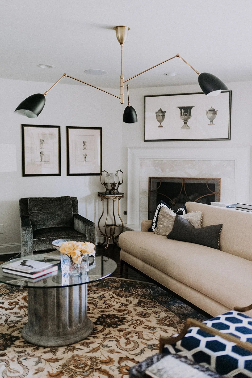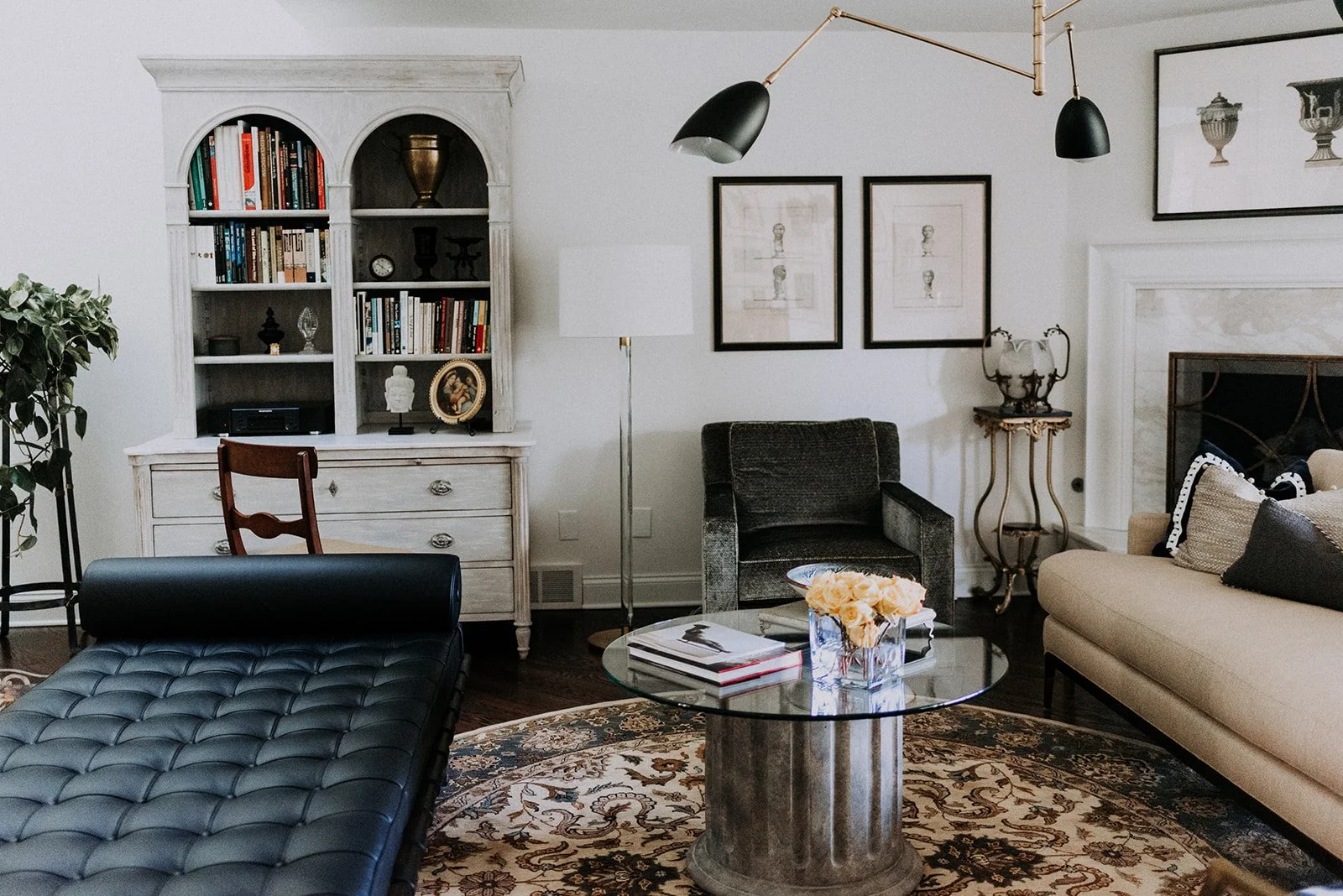 A salon-style Bauhaus daybed paired with antique furnishings, atmospheric art and elegant French sconces set the tone for the space. To frame the narrative, the homeowner’s extensive collections were thoughtfully displayed throughout the home and balanced with art-deco inspired detailing on window treatments and upholstery.