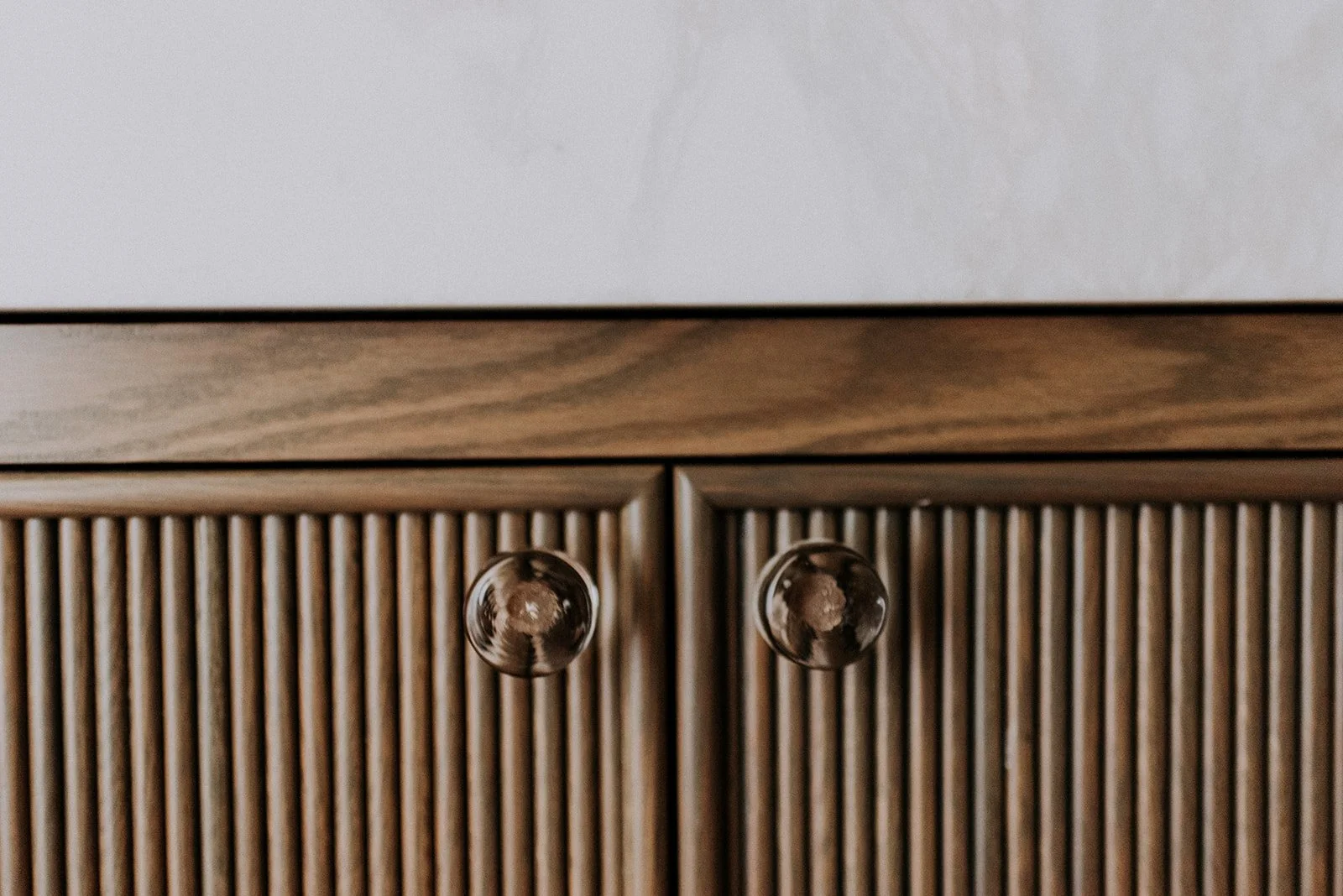 The powder room is formal yet warm with antique bronze, custom walnut cabinetry, Italian imported sconces and carved marble sink.