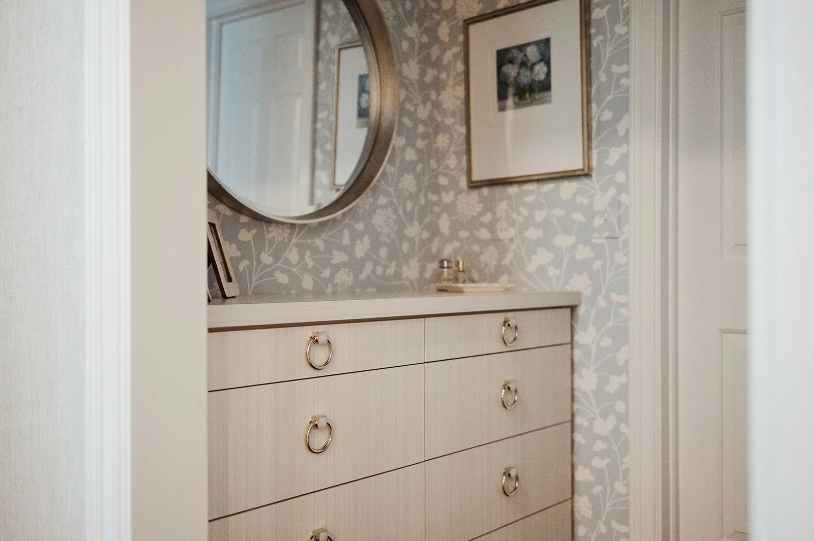 The high-traffic back door entryway was redesigned to fit a larger powder room and an organized, spacious mudroom and laundry room. New French doors complete the area, adding a touch of natural light. Soft wood tones, blues and creams lend a coastal feel. The powder room adds whimsy, with bird-adorned wallpaper and star lanterns to please the younger members of the family. In the laundry room and mudroom, custom cabinetry offers optimal hidden organization.