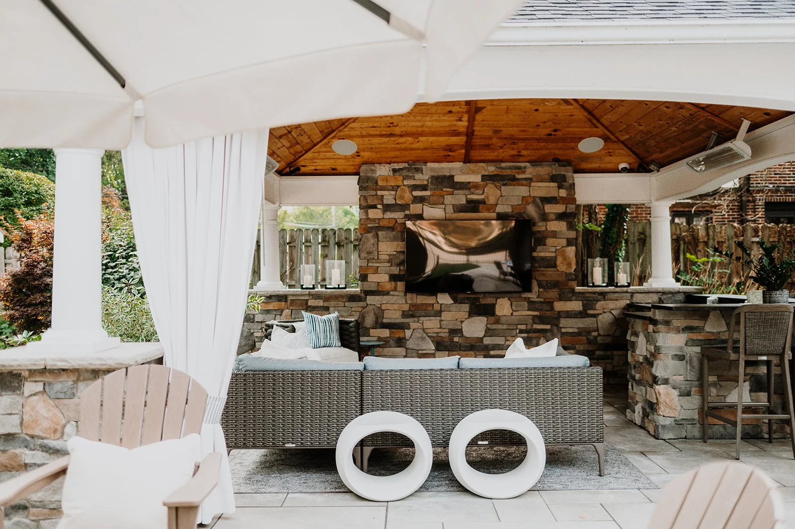 Dawn sourced hotel-quality furniture in durable performance fabrics for the heated pergola, dining area and bar. When the weather turns to winter, each piece has a custom cover ready to protect from the elements. Ample seating is available for larger gatherings. Custom curtain panels in a perennial fabric are dirt-resistant, and can close to provide shade from the sun and avoid tv glare.