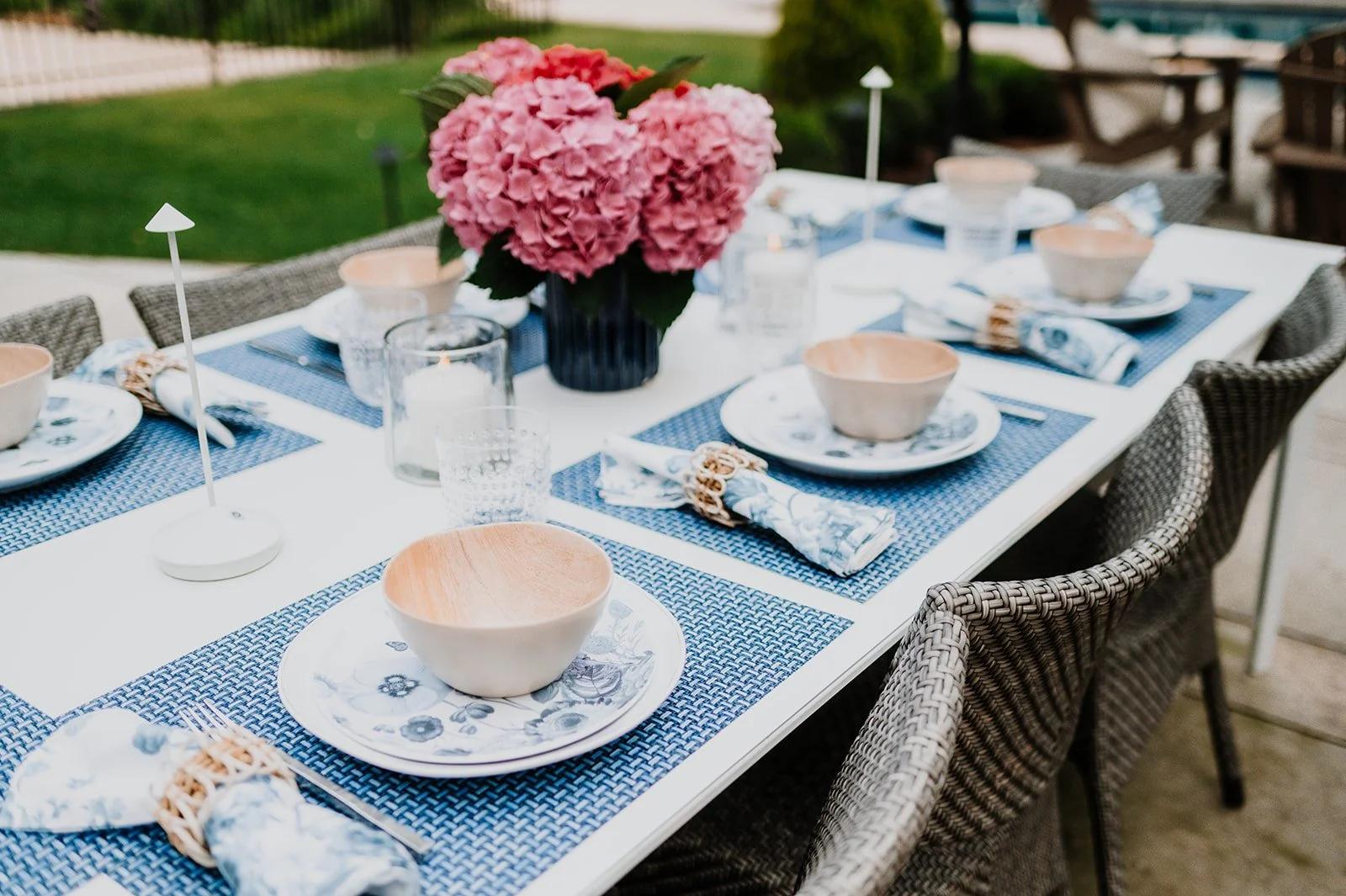 Pillows and pottery are a mix of neutral tones, contemporary patterns and pops of blue. A disco ball provides a fun surprise and nods to the client’s love of dancing at poolside parties. For the dining table, floral plates are playfully mixed with woven textures and light wood accents for a dynamic look.