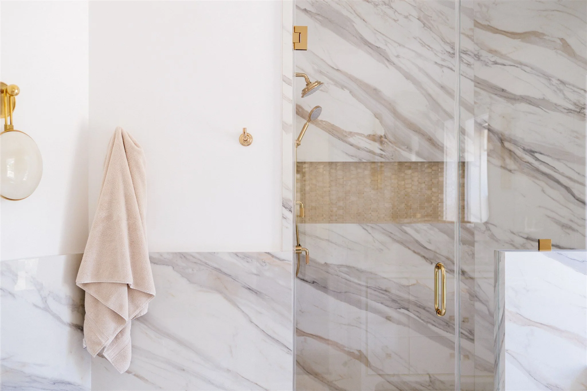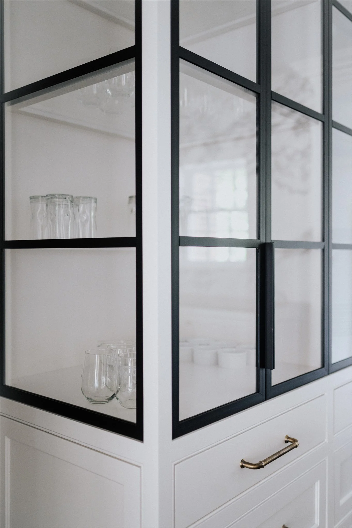 In the kitchen, a new layout defines the space. Crisp painted cabinetry lightens the space, while inset glass shelving and cabinet doors enhance transparency and visual flow. A dramatic full-height porcelain backsplash with plum-toned black veining provides depth, while the island is clad in softly veined white marble for contrast. Perimeter countertops feature a waterfall edge detailed with carved molding, reinforcing the home’s classical roots. An organic sculptural light introduces a transitional note. To accommodate the clients’ preference for expansive refrigeration without overwhelming the room, custom brass handles with wraparound inlay were designed, transforming a functional necessity into an artful focal point.