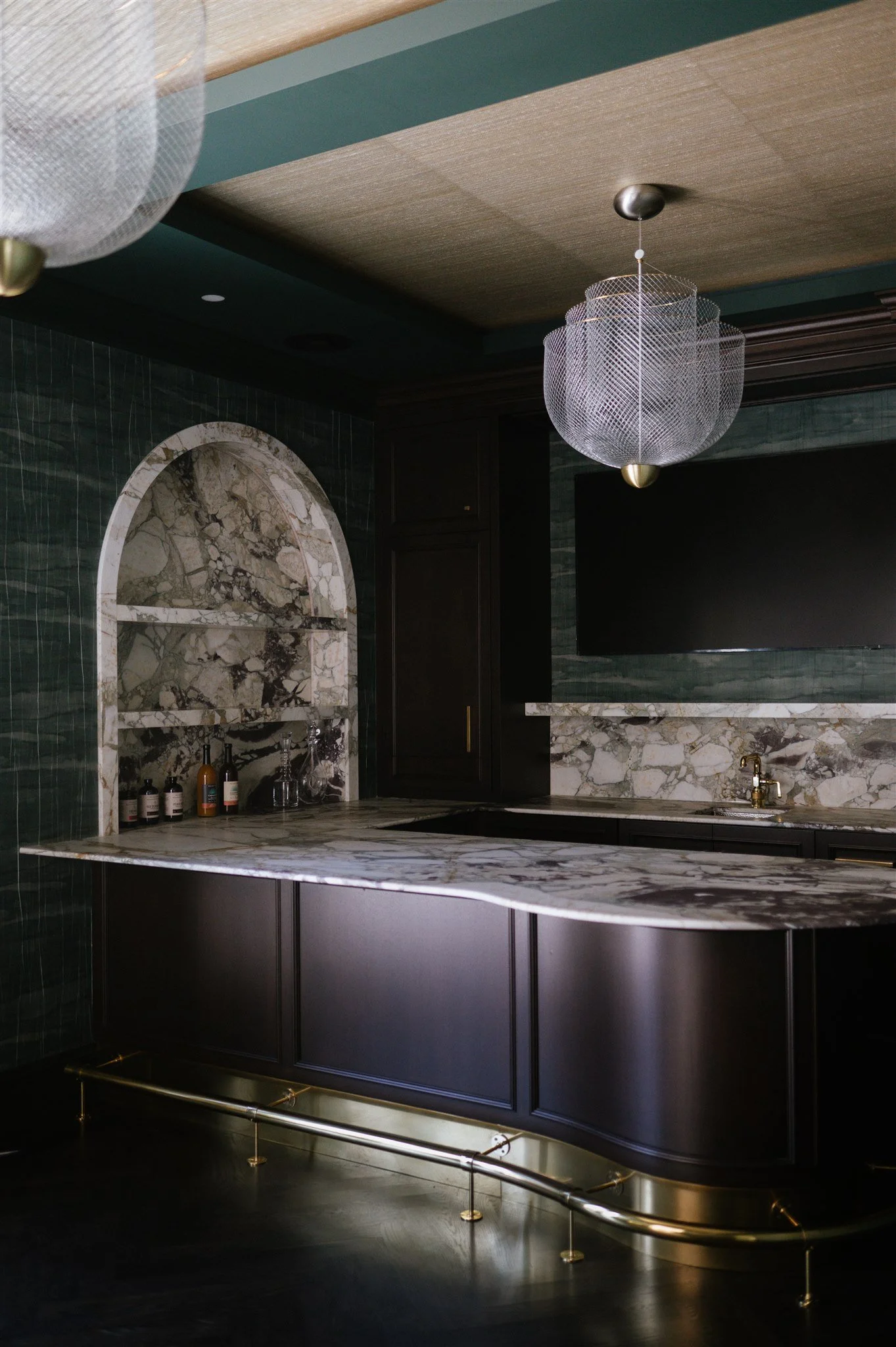 Adjacent to the living spaces, a former “man cave” was reimagined as a sophisticated bar with a private club atmosphere. Rich wallpaper, turquoise marble, and custom brass radiator covers create depth and polish. State-of-the-art appliances and technology are seamlessly integrated, while a curved bar and countertop form an elegant sculptural statement. A brass foot rail along the bar front completes the composition.