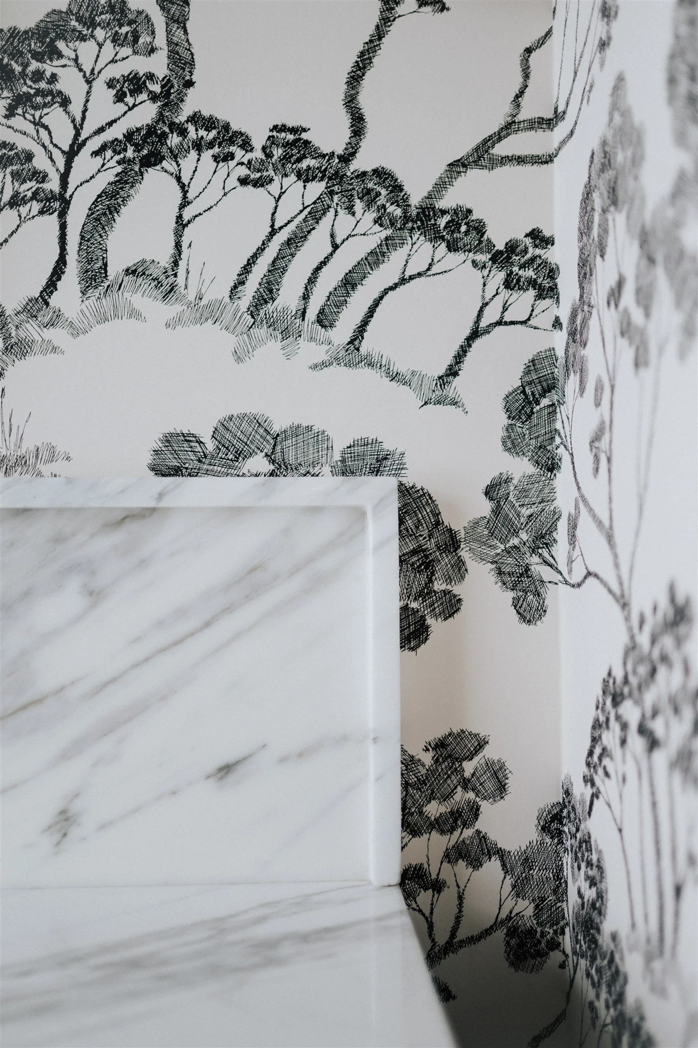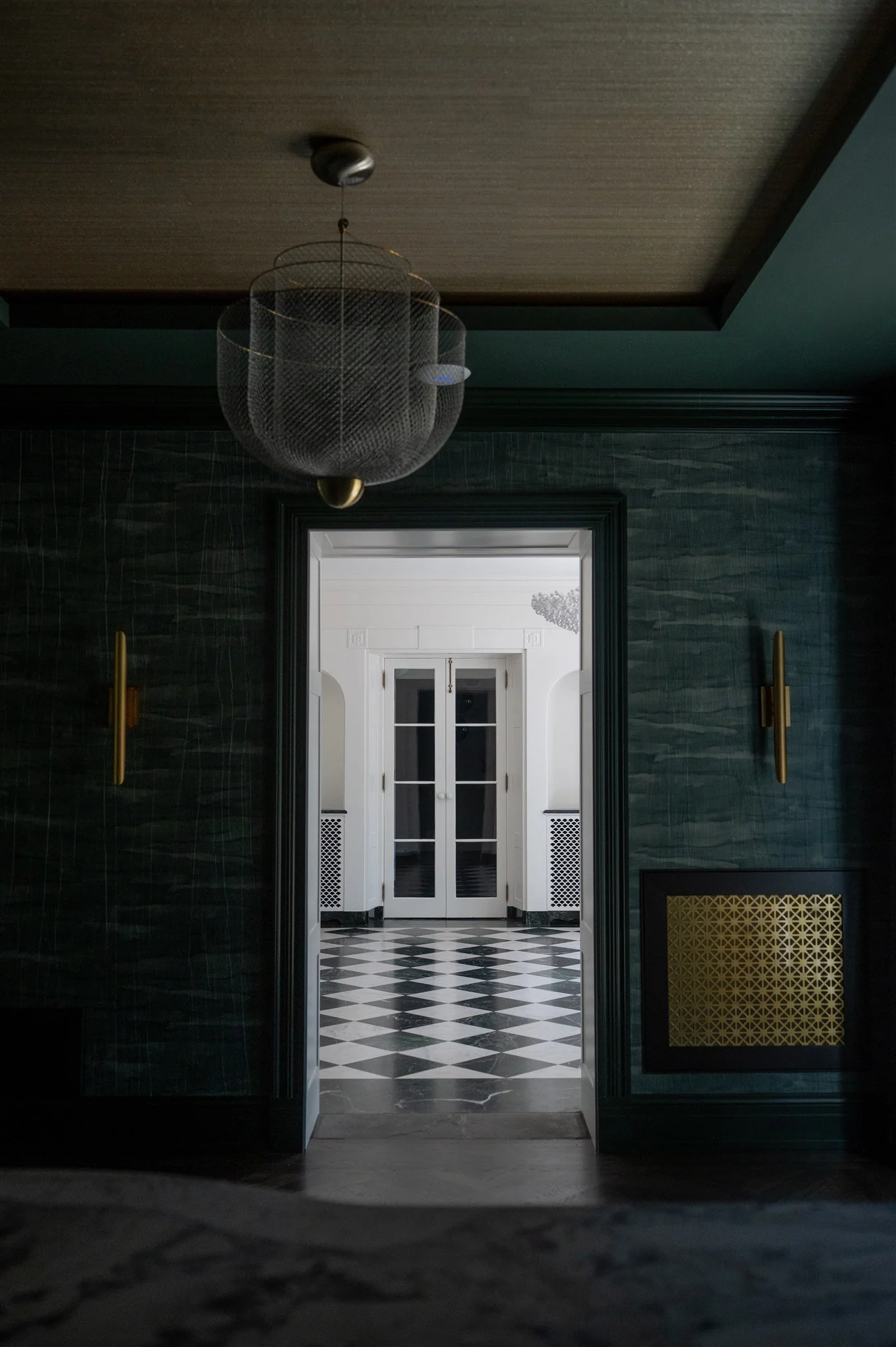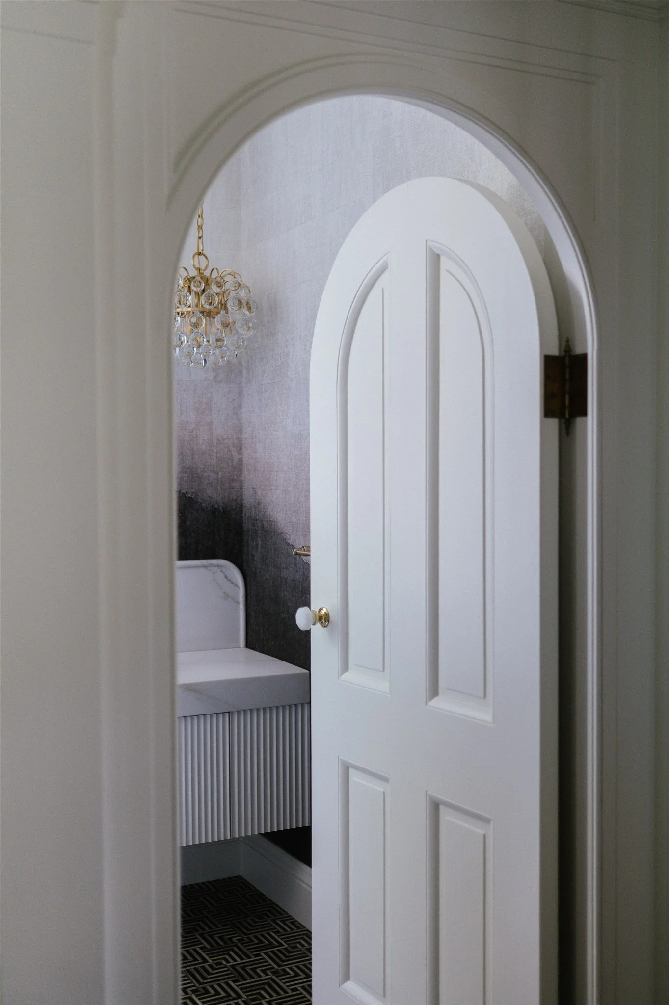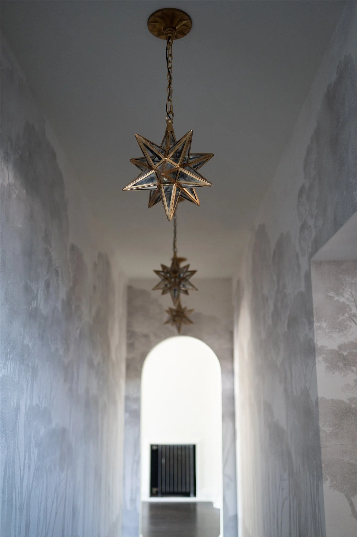 What was once a simple passageway now unfolds as a destination in itself. A sequence of graceful archways, serene tree-lined wallpaper, and star-like ceiling fixtures evokes a European sensibility, transforming a utilitarian corridor into an everyday moment of delight.